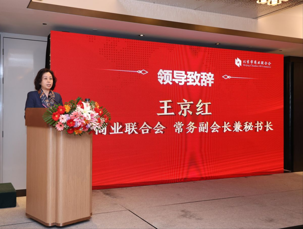 中国商业联合会常务副会长兼秘书长王京红在致辞中,对大会召开表示热烈祝贺,高度评价北京市商业联合会坚守服务宗旨、发挥桥梁纽带作用,在推动首都商业服务品质升级、激发行业活力中作出的积极贡献。她强调,面对 “十五五” 规划新征程,商会应进一步强化引领与服务职能,凝聚行业合力,为首都商业高质量发展注入更强动力。